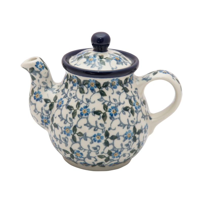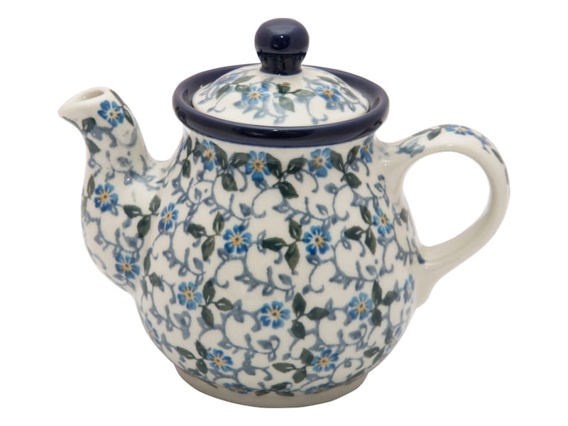 Teekanne mit Sieb zum Brauen von Kräutern und Tee. Original Bunzlauer Keramik. Blumenmuster in blau - BLAU WIESE. Kobaltblauer (dunkelblauer) Rand.