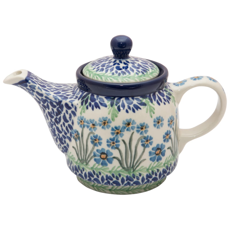 Teekanne mit Sieb zum Brauen von Kräutern und Tee. Original Bunzlauer Keramik. Blumenmuster in blau - BLAU WIESE. Kobaltblauer (dunkelblauer) Rand.