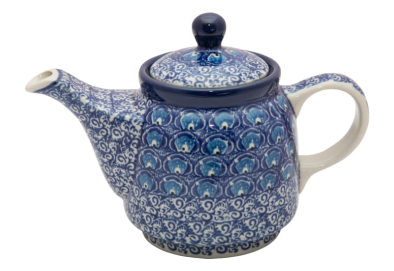 Teekanne mit Sieb zum Brauen von Kräutern und Tee. Original Bunzlauer Keramik. Einzigartig Muster in grün und kobaltblau mit Motiv Pfauenfedern. Kobaltblauer (dunkelblauer) Rand.