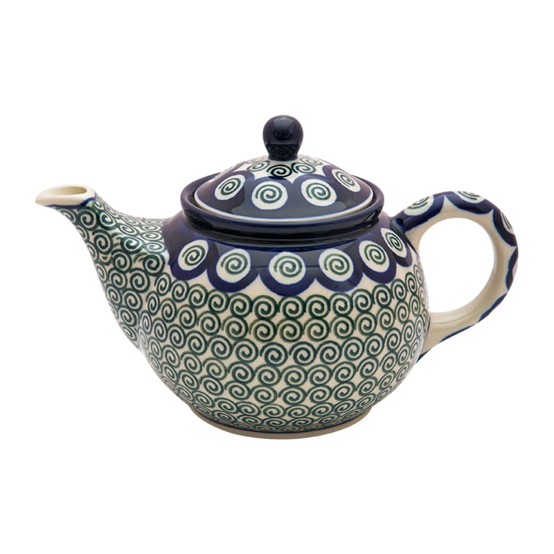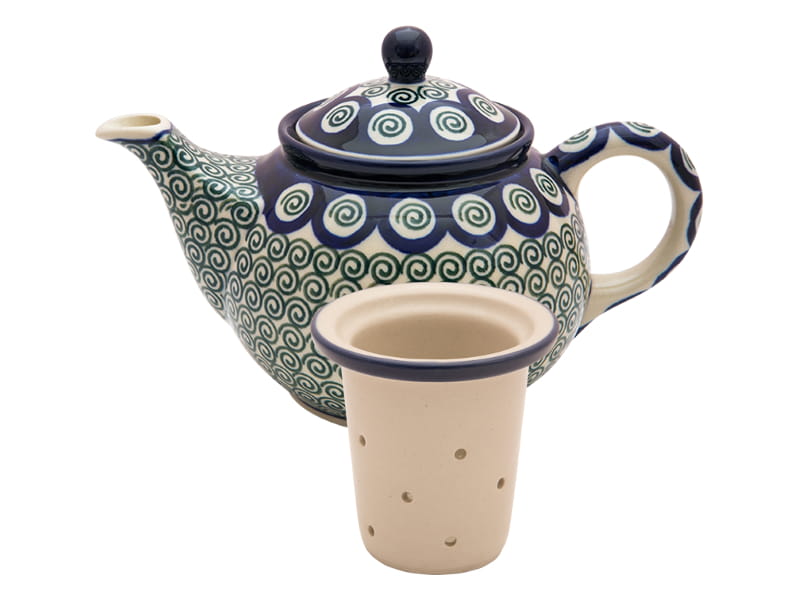 Teekanne mit Sieb zum Brauen von Kräutern und Tee. Original Bunzlauer Keramik. CLASSIC Muster - VINTAGE-Stil. Grüne Spiralen. Kobaltblauer (dunkelblauer) Rand.
