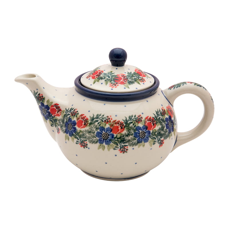 Teekanne mit Sieb zum Brauen von Kräutern und Tee. Original Bunzlauer Keramik. BLUMENmuster in rot und marineblau. Kobaltblauer (dunkelblauer) Rand.