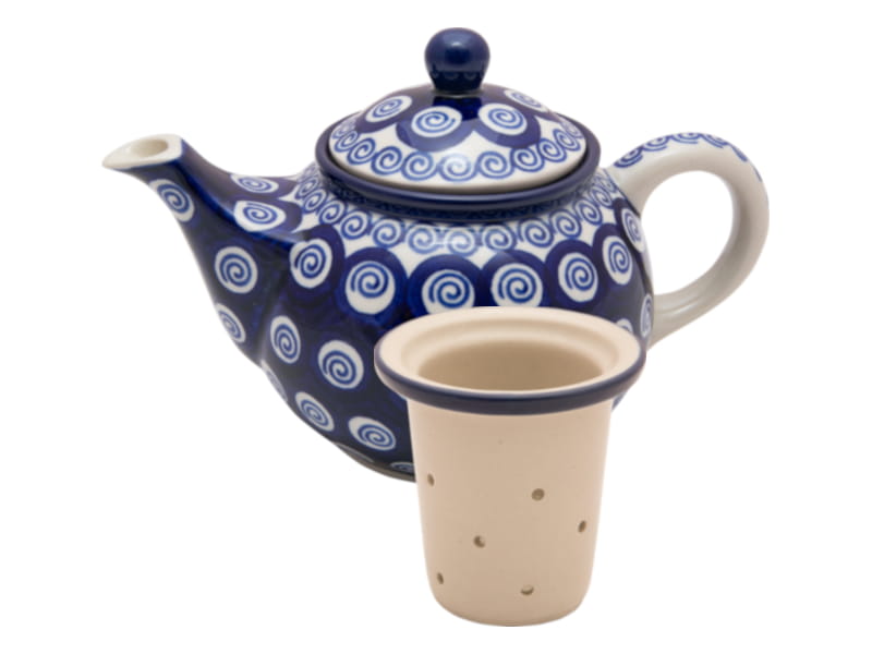 Teekanne mit Sieb zum Brauen von Kräutern und Tee. Original Bunzlauer Keramik. Classic Muster - Spiralen in dunkelblau. Kobaltblauer (dunkelblauer) Rand.
