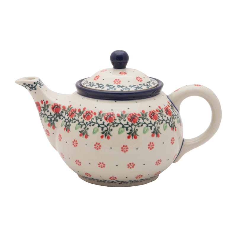 Teekanne mit Sieb zum Brauen von Kräutern und Tee. Original Bunzlauer Keramik. Blumenmuster in rot. Kobaltblauer (dunkelblauer) Rand.