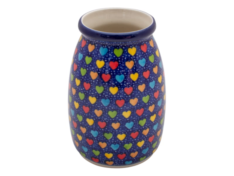 EINZIGARTIGES Unikat Muster- Herzmuster. Mehrfarbige Herzen auf marineblauem Hintergrund. Kobaltblauer (dunkelblauer) Rand. Original Bunzlauer Keramik.