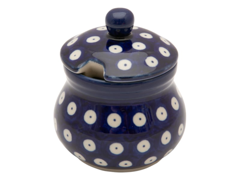 Original Bunzlauer Keramik. CLASSIC Muster. Weiße Punkte auf dunkel-blauem Hintergrund. Weißer Rand (Die natürliche Farbe des Brennprozesses).