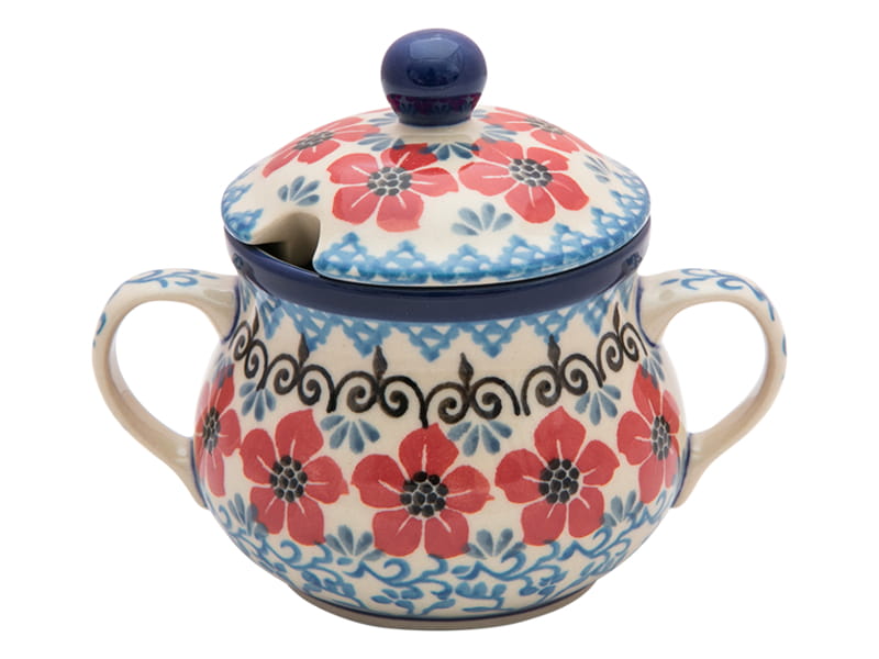 Original Bunzlauer Keramik. UNIQUE-Muster. Frühlingsblumen in hellblau, rot und weiß. Kobaltblauer (dunkelblauer) Rand.