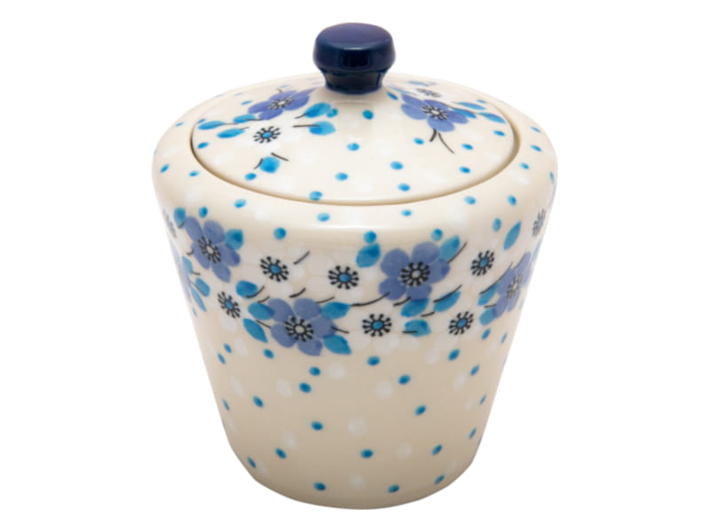 Original Bunzlauer Keramik. CLASSIC Muster. Weiße Punkte auf dunkel-blauem Hintergrund. Weißer Rand (Die natürliche Farbe des Brennprozesses).