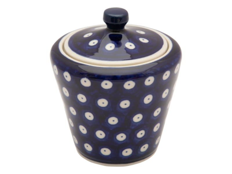 Original Bunzlauer Keramik. CLASSIC Muster. Weiße Punkte auf dunkel-blauem Hintergrund.