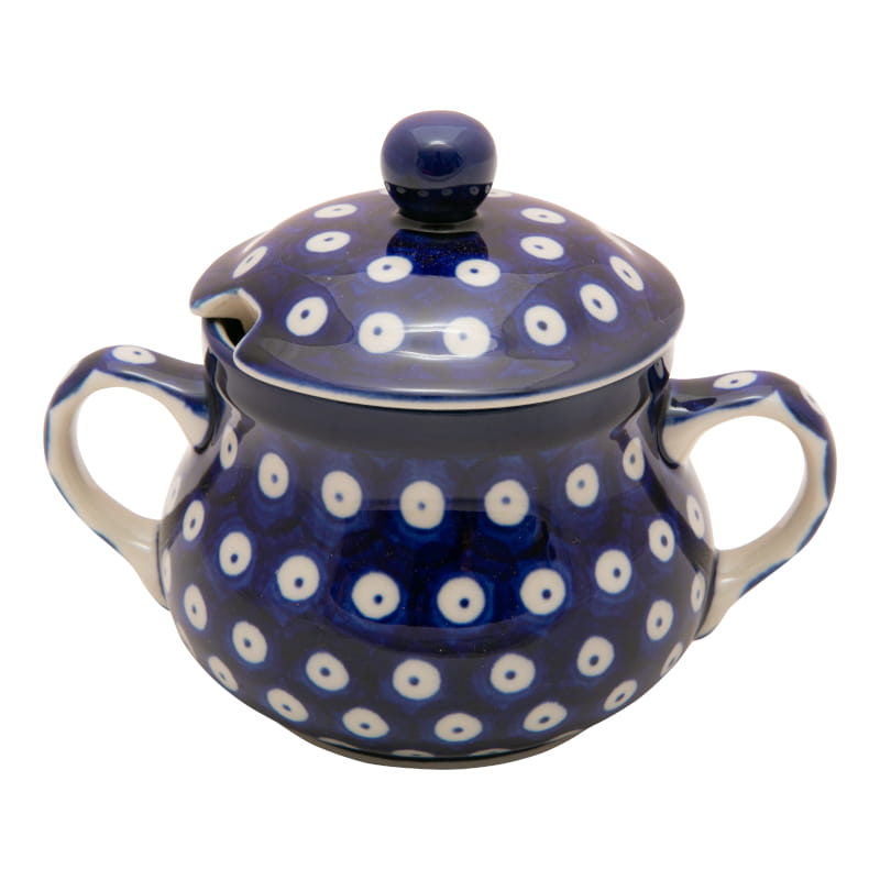 Original Bunzlauer Keramik. CLASSIC Muster. Weiße Punkte auf dunkel-blauem Hintergrund. Weißer Rand (Die natürliche Farbe des Brennprozesses).