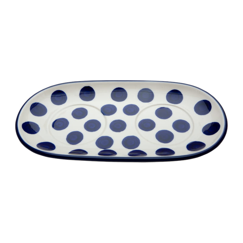 Classic Muster VINTAGE-Stil. Große blaue Punkte auf weißem Hintergrund. Kobaltblauer (dunkelblauer) Rand. Original Bunzlauer Keramik.