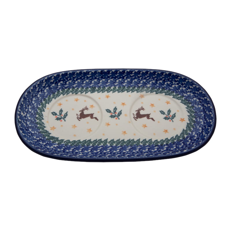 Weinachtsmuter in den Farben Blau, Grün und Braun mit gelben Sternen und roten Stechpalmenfrüchten. Es zeichnet sich durch Rentiere. Kobaltblauer (dunkelblauer) Rand. Original Bunzlauer Keramik.