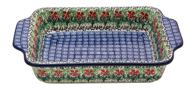 Ceramika Bolesławiec - HANDMADE. Wzór kwiatowy w kolorze czerwonym i motywami roślinnymi - OGRÓD NA TALERZU. Wykończenie obrzeża w kolorze granatowym.