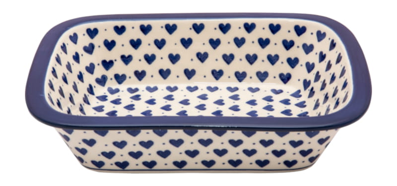 Boleslawiec pottery - handpainted. Classic pattern in a vintage style. Navy blue hearts on a white background. Border in navy blue.