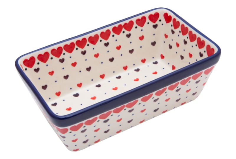 HEART pattern. Red and brown hearts and tiny blue dots. Border in navy blue. Boleslawiec pottery - handpainted.