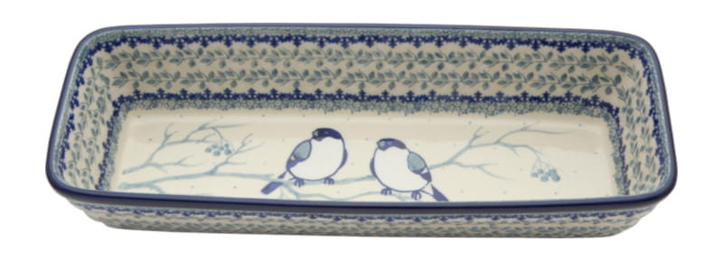 Boleslawiec pottery - handpainted. Unique pattern. Birds in winter colors. Border in navy blue.
