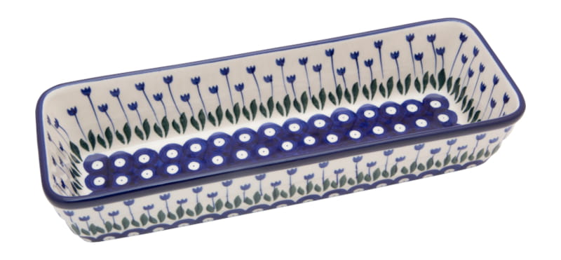 Boleslawiec pottery - handpainted. Floral pattern in blue, navy blue and green. The edge in navy blue.