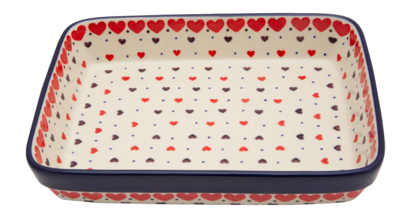 HEART pattern. Red and brown hearts and tiny blue dots. Border in navy blue. Boleslawiec pottery - handpainted.