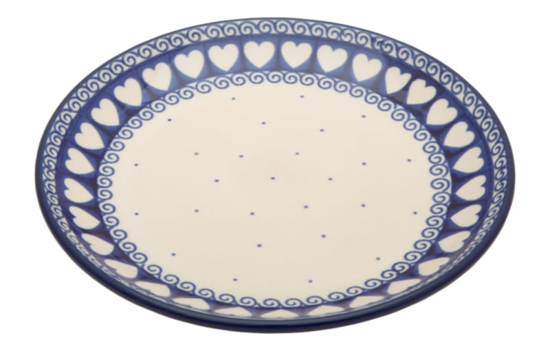 Boleslawiec pottery - handpainted. Classic pattern - a strip of white hearts on a navy blue background, fine dots and spirals in navy blue. Border in navy blue.
