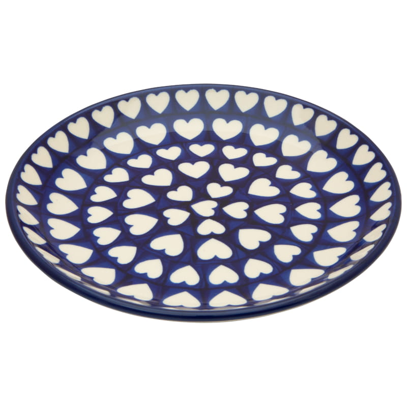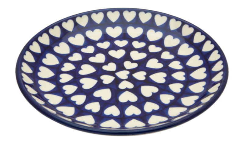 Boleslawiec pottery - handpainted. Classic pattern in a vintage style. White hearts on a navy blue background. Border in navy blue.
