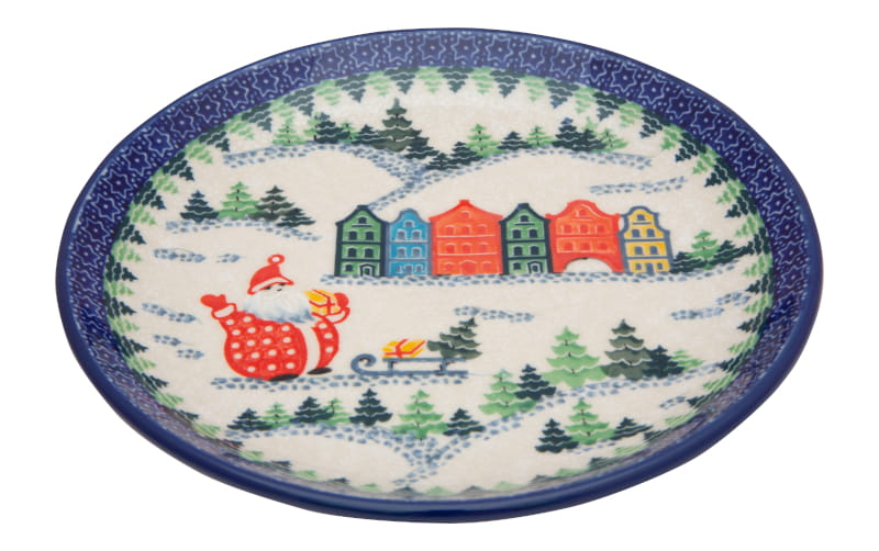 UNIQUE Christmas pattern. Santa Claus and houses against the background of a winter landscape. Border in navy blue. Boleslawiec pottery - handpainted.
