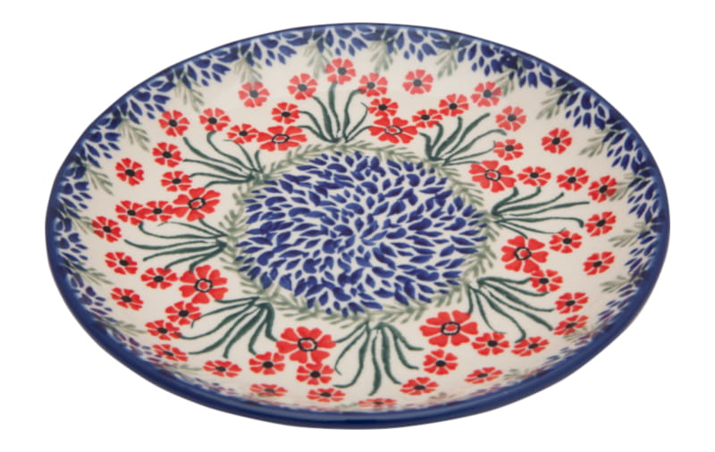 Boleslawiec pottery - handpainted. Floral pattern in red. Border in navy blue.