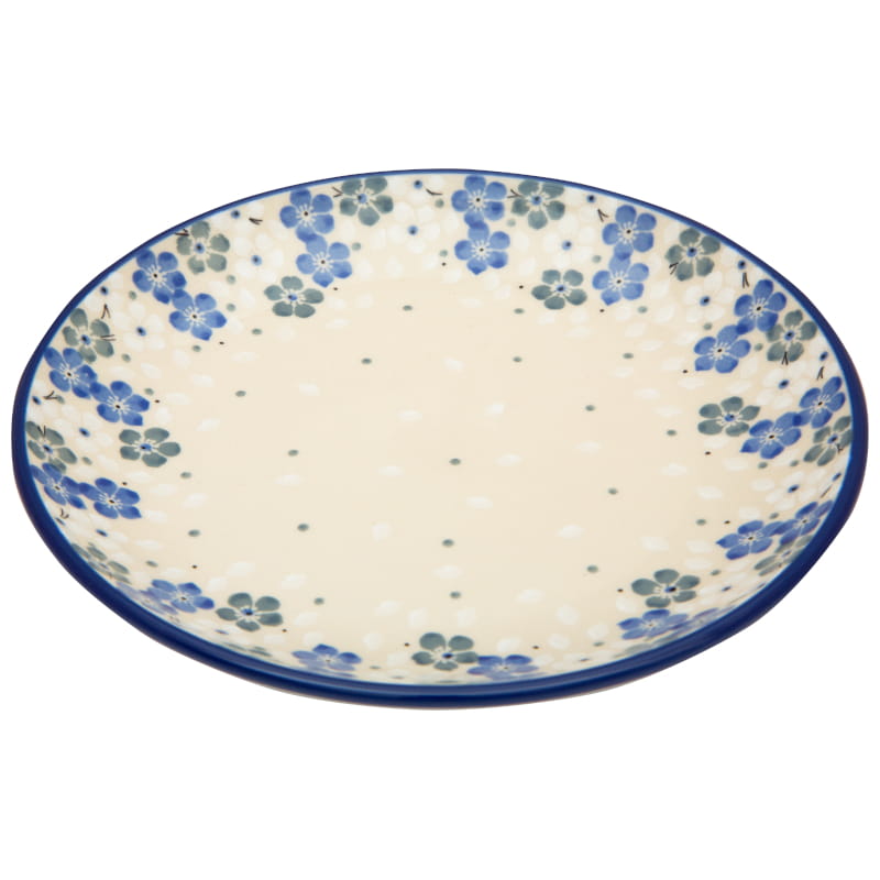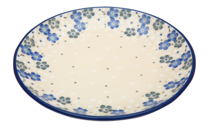 Boleslawiec pottery - handpainted. Floral pattern. Subtle flowers in blue, white and gray. Border in navy blue.