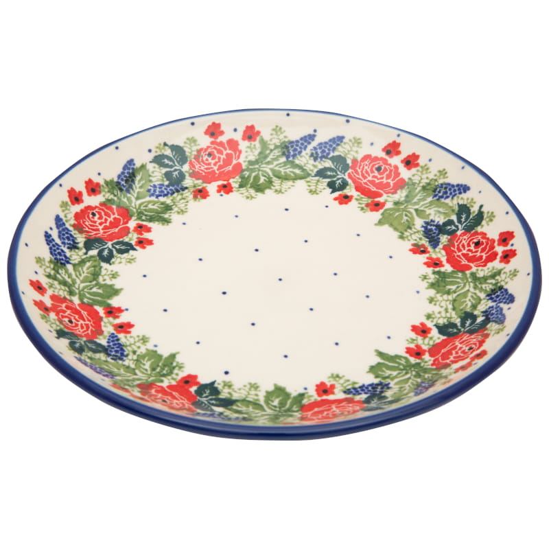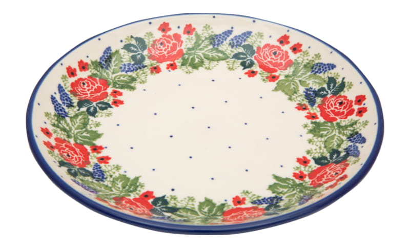 Boleslawiec pottery - handpainted. Floral pattern in red, blue and green. Roses, poppies and delphinium. The edge in navy blue.