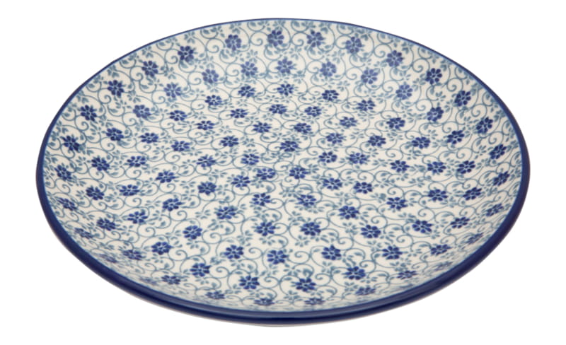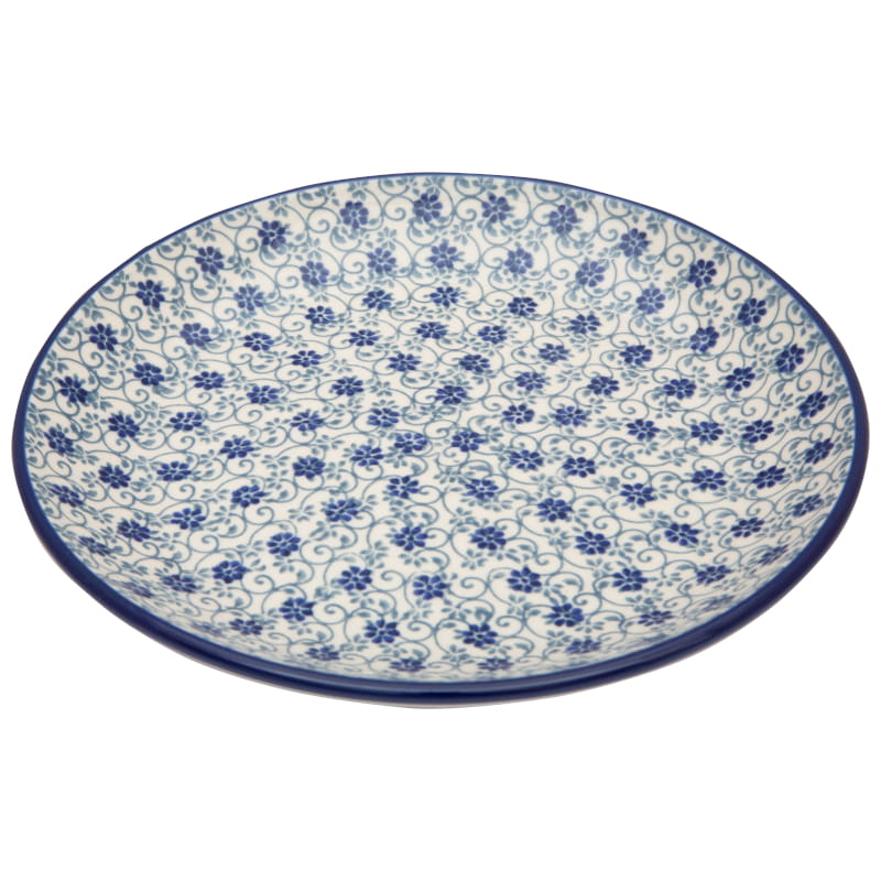 Boleslawiec pottery - handpainted. Floral pattern in navy blue and light gray. Border in navy blue.