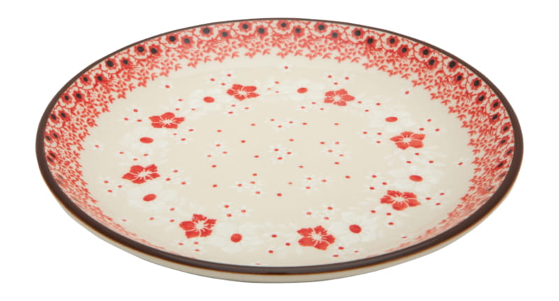 Boleslawiec pottery - HANDMADE. Pattern with flowers in delicate colors - red and white. The edge is finished in brown.