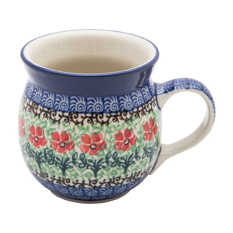 Ceramika Bolesławiec - HANDMADE. Wzór kwiatowy w kolorze czerwonym i motywami roślinnymi - OGRÓD NA TALERZU. Wykończenie obrzeża w kolorze granatowym.