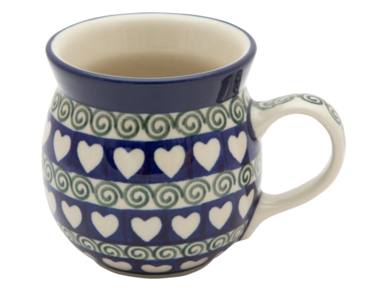 HEART pattern - white hearts on a navy blue background and green spirals. Border in navy blue. Boleslawiec pottery - handpainted.