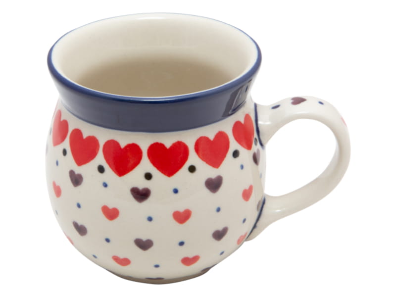 HEART pattern. Red and brown hearts and tiny blue dots. Border in navy blue. Boleslawiec pottery - handpainted.