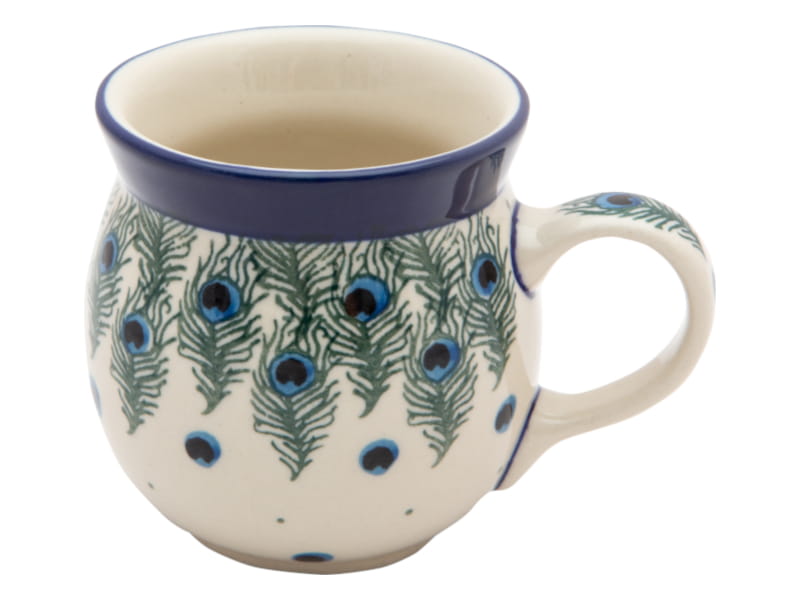 Boleslawiec pottery - handpainted. Pattern in green and cobalt blue. Unique peacock feathers motif. Border in navy blue.
