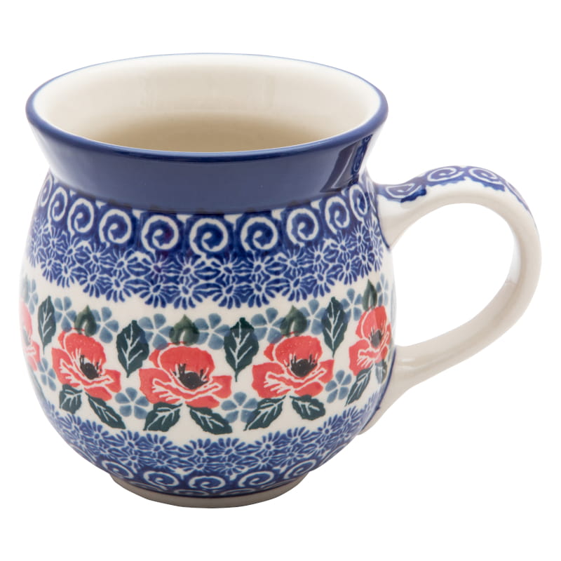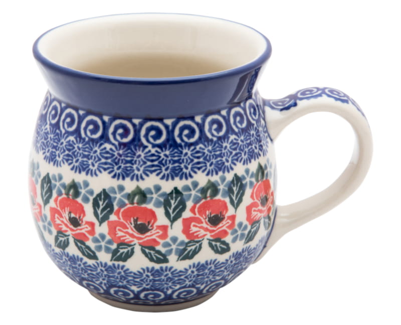 Ceramika Bolesławiec - Handmade. Wzór KWIATOWY w kolorze czerwonym. Wykończenie obrzeża w kolorze granatowym.