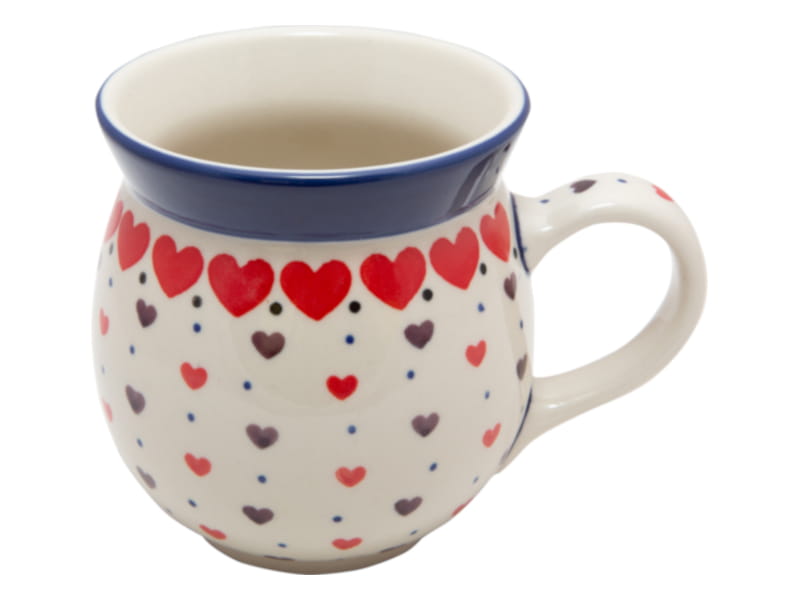 HEART pattern. Red and brown hearts and tiny blue dots. Border in navy blue. Boleslawiec pottery - handpainted.