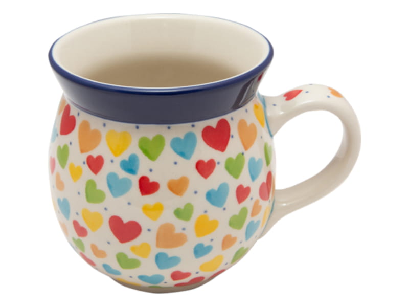 UNIQUE pattern - heart pattern. Different colored hearts in the colors of happiness. Border in navy blue. Boleslawiec pottery - handpainted.