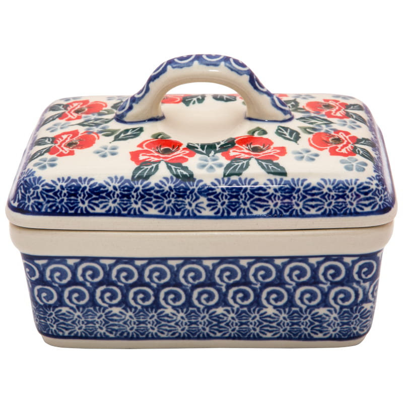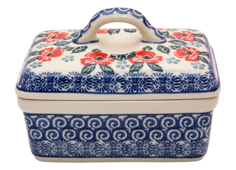 Boleslawiec pottery - handpainted. Floral patttern in red. The edge in navy blue.