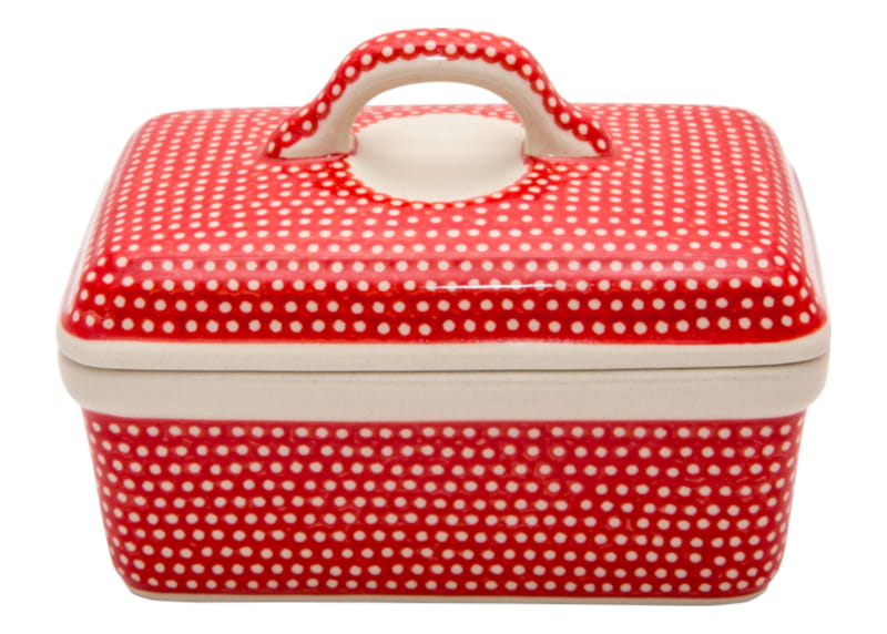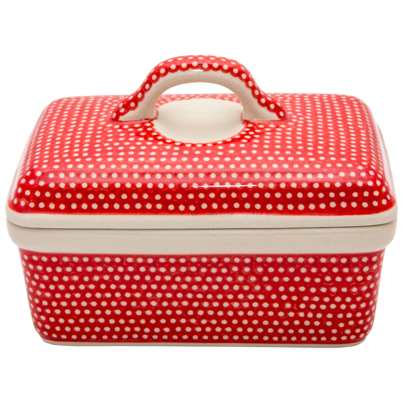Boleslawiec pottery - handpainted. Unique pattern in a classic style - fine dots on a red background. Border in creamy white (natural ceramics firing color).