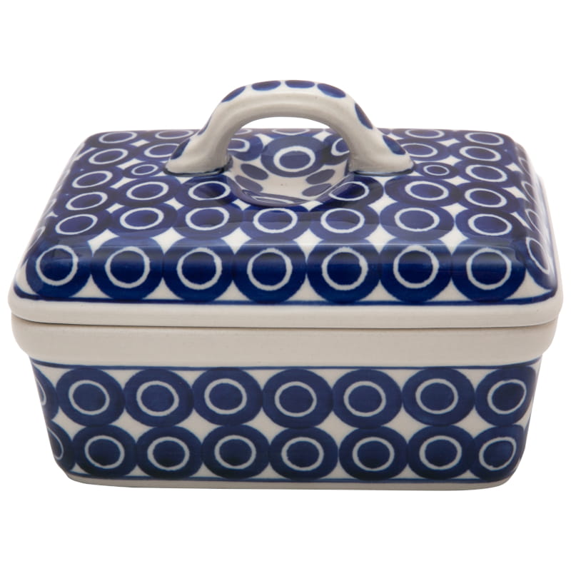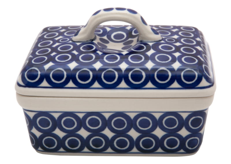Boleslawiec pottery - handpainted. Classic pattern in a vintage style - large eye-like circles on a white background. Border in creamy white (natural ceramics firing color).