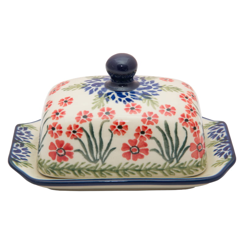 Boleslawiec pottery - handpainted. Floral pattern in red. Border in navy blue.