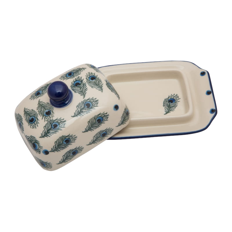 Boleslawiec pottery - handpainted. Pattern in green and cobalt blue. Unique peacock feathers motif. Border in navy blue.