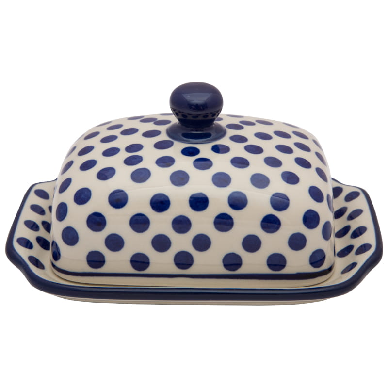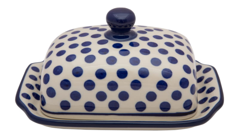 Boleslawiec pottery - handpainted. Classic pattern in a vintage style - navy blue dots on a white background. Border in navy blue.