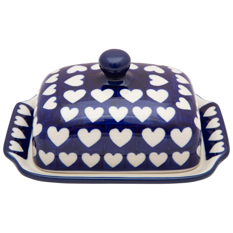 Boleslawiec pottery - handpainted. Classic pattern in a vintage style. White hearts on a navy blue background. Border in navy blue.