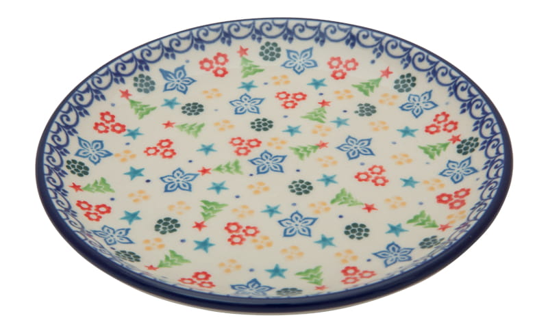 Winter, unique pattern. Various shapes of snowflakes in shades of green and red. The edge finished in navy blue. Boleslawiec pottery - handpainted.