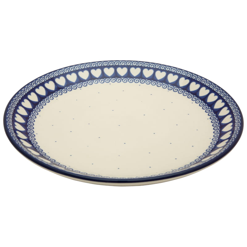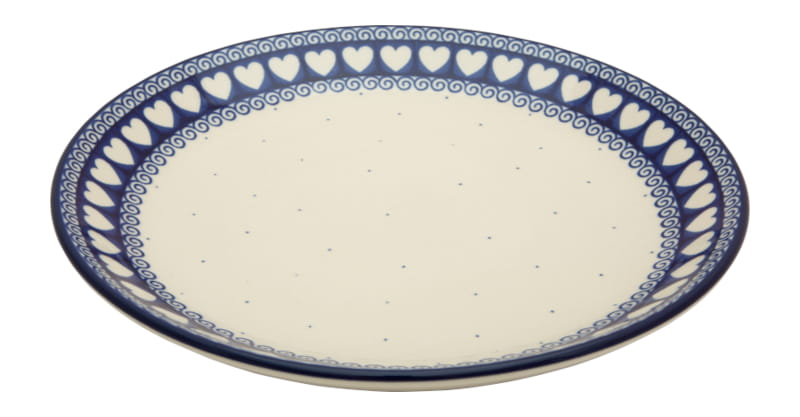 Classic pattern - a strip of white hearts on a navy blue background, fine dots and spirals in navy blue. Border in navy blue. Boleslawiec pottery - handpainted.