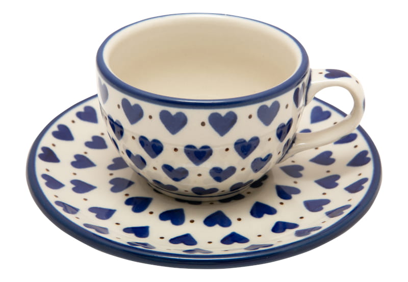 Boleslawiec pottery - handpainted. Classic pattern - navy blue hearts and fine red dots. The edge in navy blue.