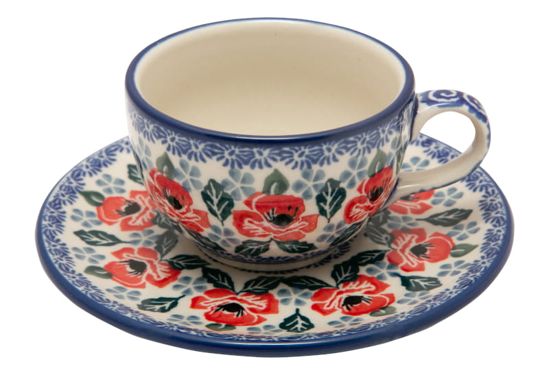 Boleslawiec pottery - handpainted. Floral patttern in red. The edge in navy blue.