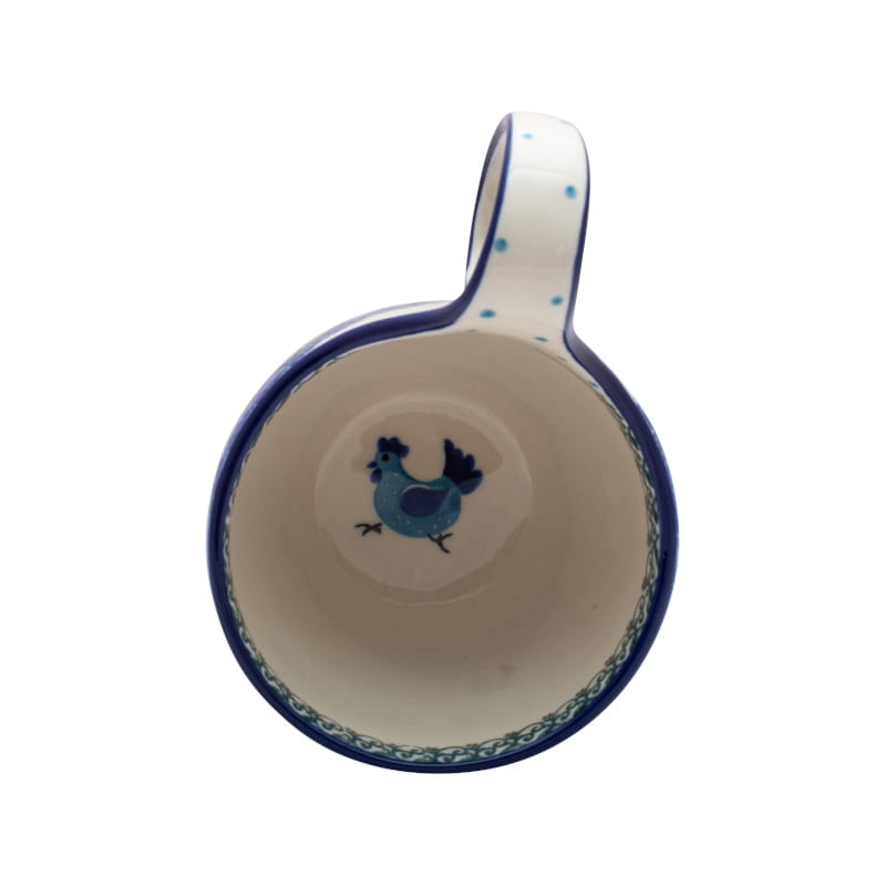 Pattern with hens. Running hen in blue and navy blue. Plant motive. The edge is finished in navy blue. Bolesławiec pottery – Handpainted.