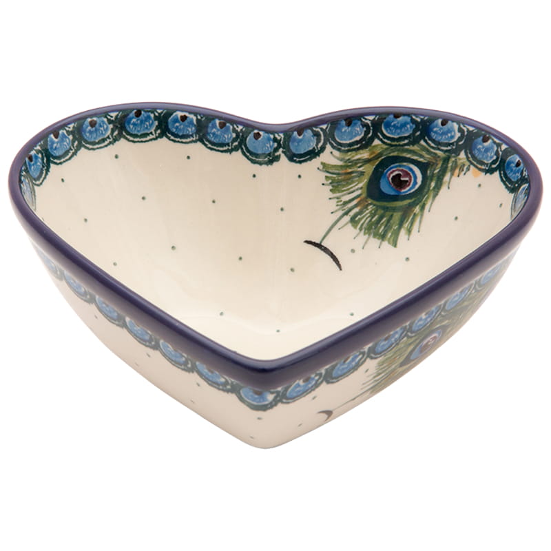 Ceramika Bolesławiec - HANDMADE. Wzór w kolorach zieleni i kobaltowego błękitu. Niepowtarzalny motyw PAWICH PIÓR . Wykończenie obrzeża w kolorze granatowym.