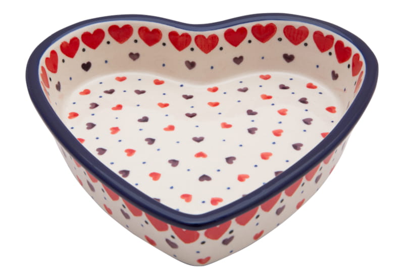 HEART pattern. Red and brown hearts and tiny blue dots. Border in navy blue. Boleslawiec pottery - handpainted.